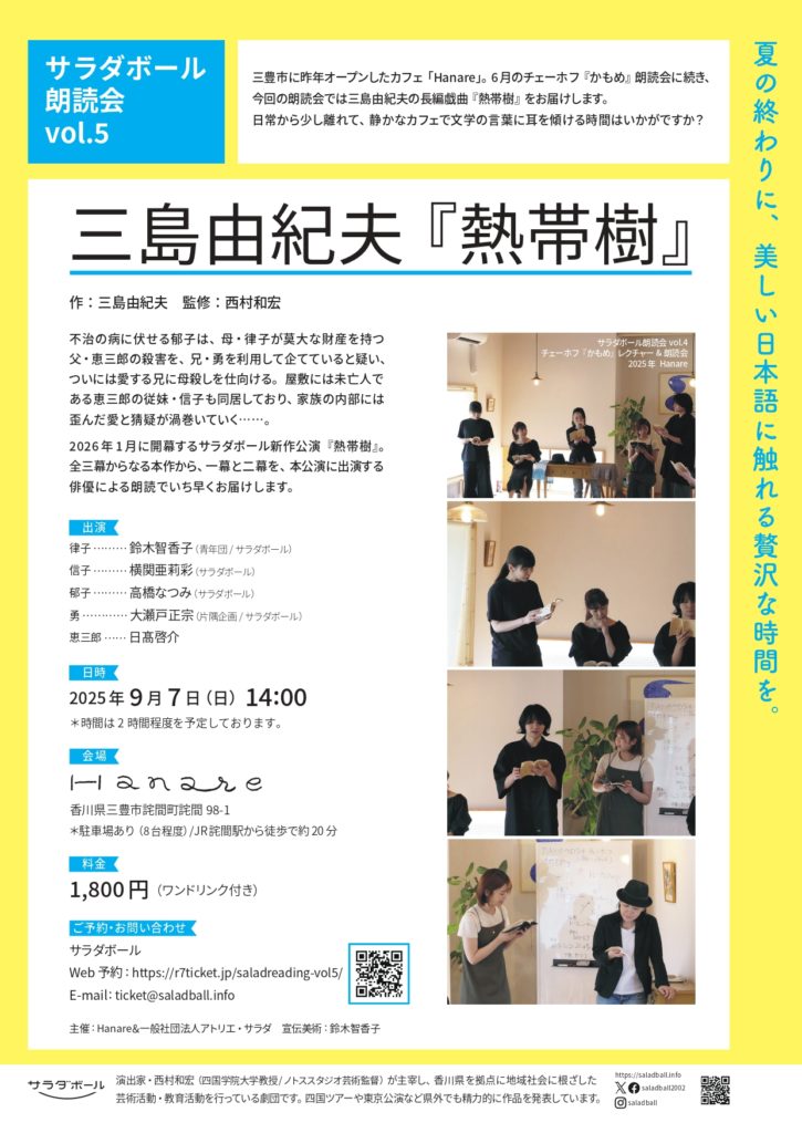 三豊市に昨年オープンしたカフェ「Hanare」。6月のチェーホフ『かもめ』朗読会に続き、今回の朗読会では三島由紀夫の長編戯曲『熱帯樹』をお届けします。